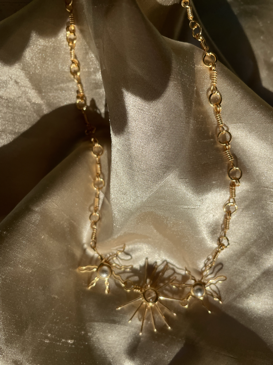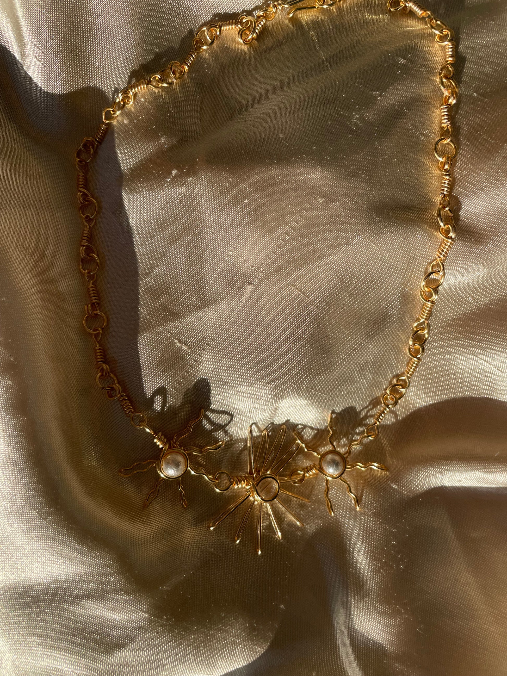 Cadena artesanal elaborada con alambre AAA non tarnish en tres calibres, tejida a mano con técnica de envoltura. El diseño central presenta tres soles radiantes: dos con perla nácar y uno con cuarzo pulido, evocando luz, elegancia y conexión natural. Pieza única, ligera y resistente, ideal para quienes buscan arte portátil con alma caribeña.