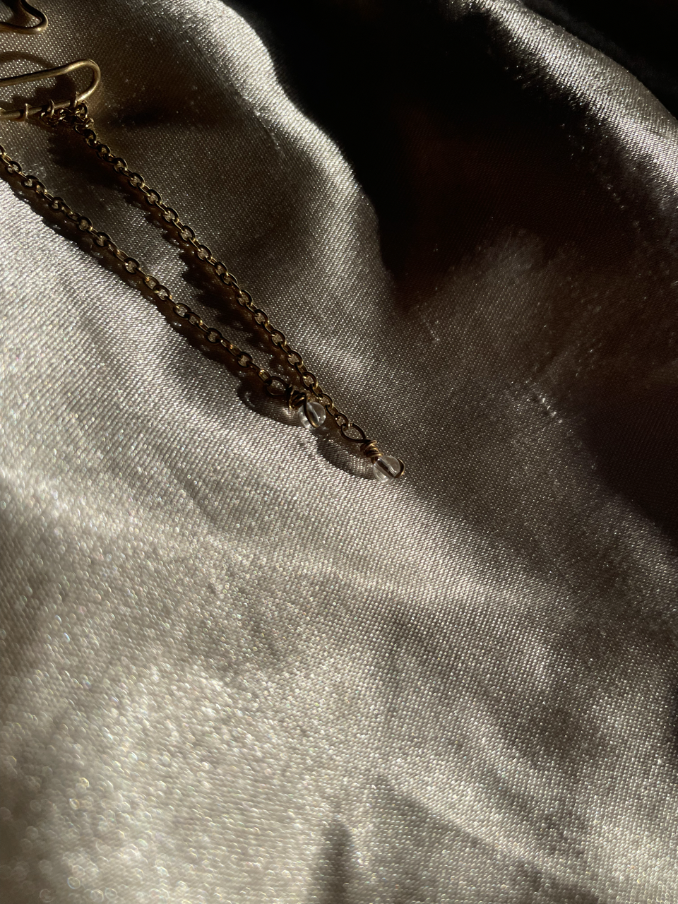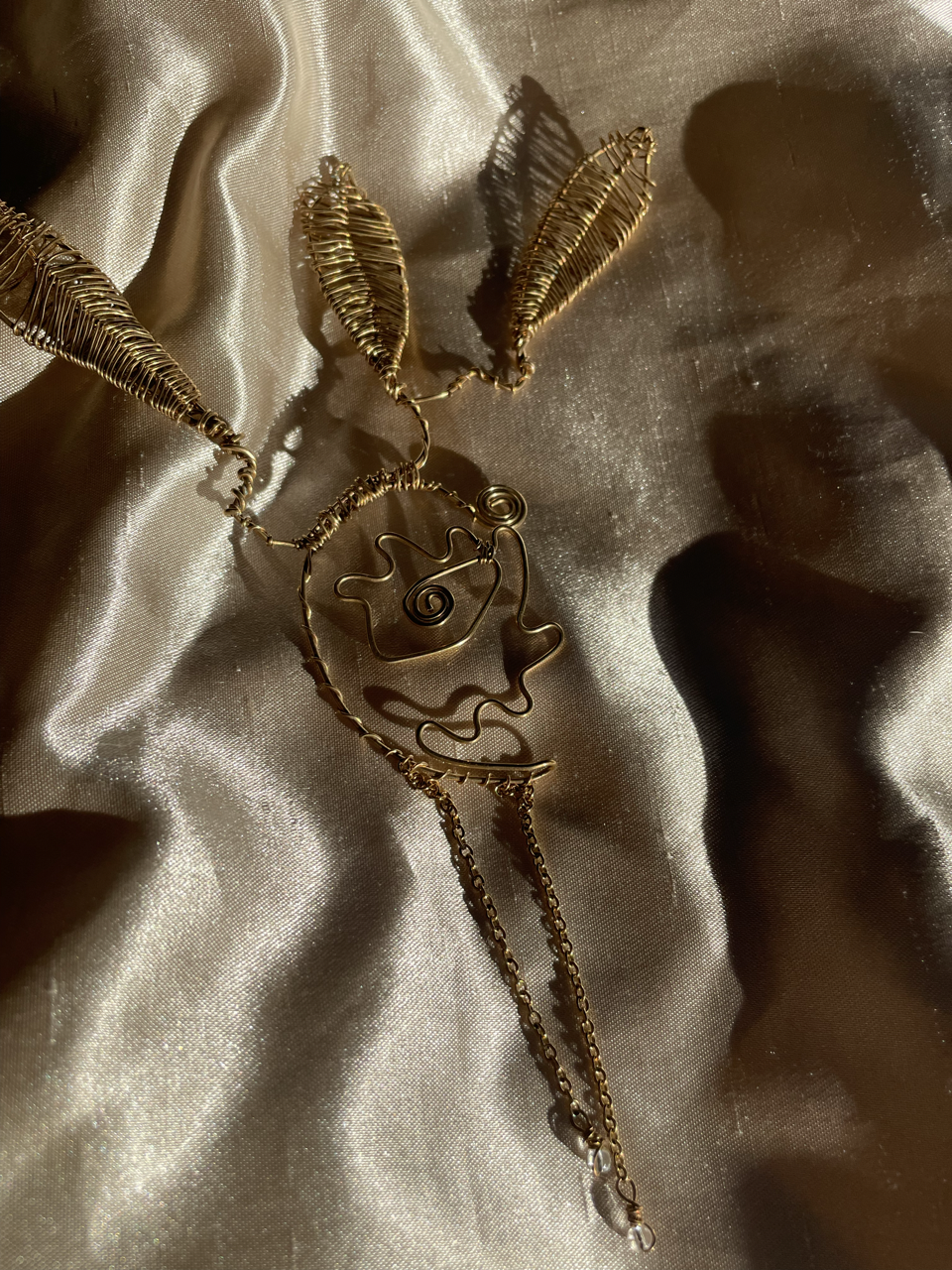 Earcuff artesanal en brass rojo con diseño abstracto inspirado en los vejigantes. El alambrado forma un rostro expresivo con detalles en cuarzo pulido y hojas simbólicas. Incluye cadenas en acero inoxidable enchapadas en oro que aportan movimiento y brillo. Pieza única, llena de carácter y tradición, con acabado limpio y estructura firme.