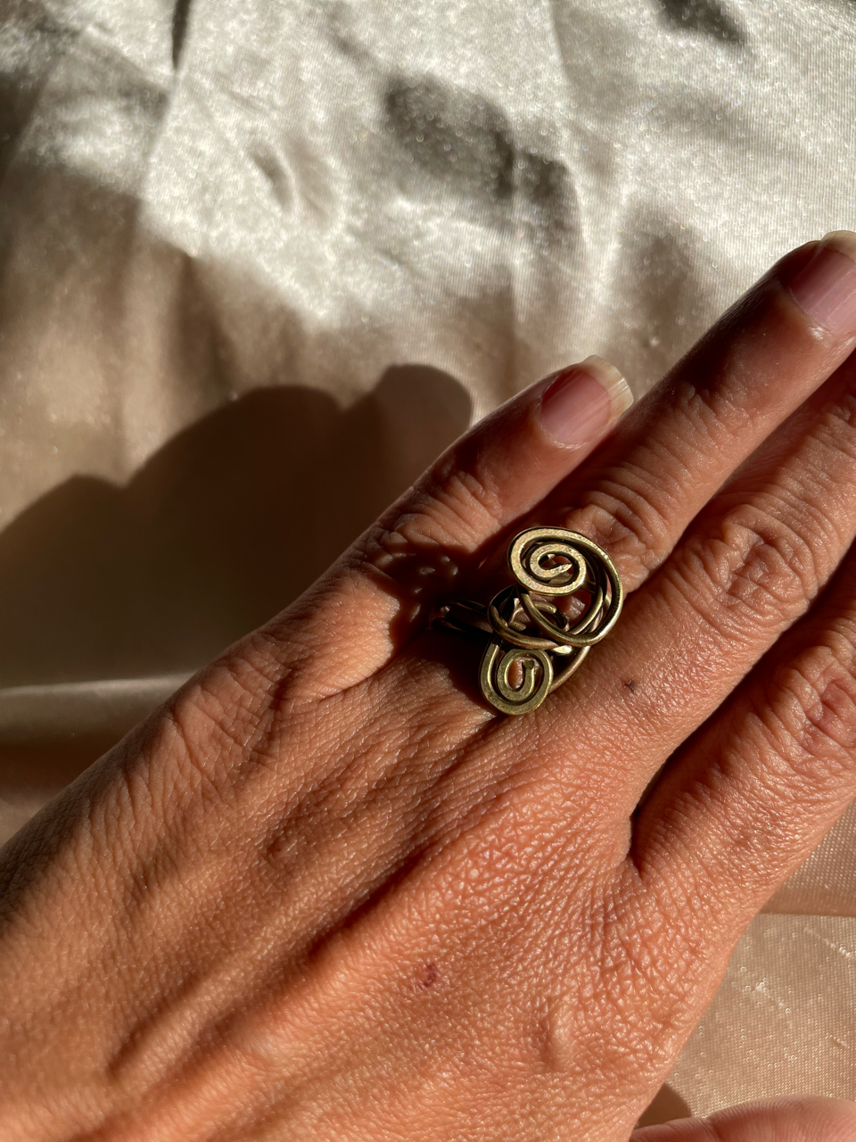 Una pieza que celebra la conexión y el equilibrio. Esta sortija artesanal está elaborada con alambre de brass amarillo oxidado, formando dos espirales entrelazadas que evocan dualidad, armonía y movimiento perpetuo. Su diseño simétrico y envolvente aporta un toque místico y elegante, perfecto para quienes valoran la belleza simbólica y el arte hecho a mano. Ligera, cómoda y cargada de intención, esta joya es ideal para el uso diario o como amuleto personal.