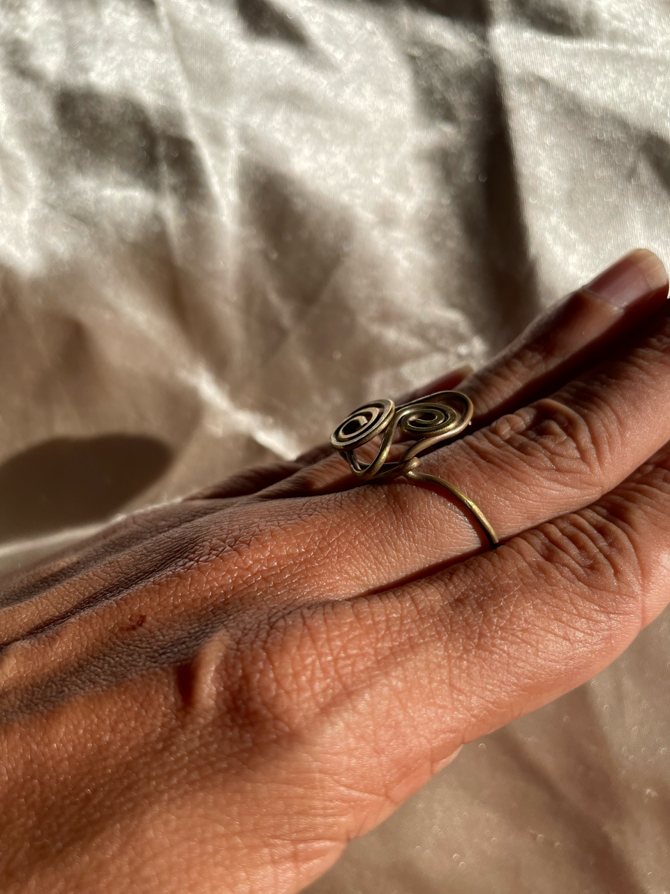 Una joya que danza entre lo simbólico y lo minimalista. Esta sortija está elaborada a mano con alambre de brass amarillo oxidado, formando dos espirales paralelas que evocan equilibrio, dualidad y movimiento continuo. Su diseño limpio y envolvente la convierte en una pieza versátil, ideal para el uso diario o como amuleto personal. Ligera, cómoda y cargada de intención, esta sortija es una declaración de estilo con alma artesanal.