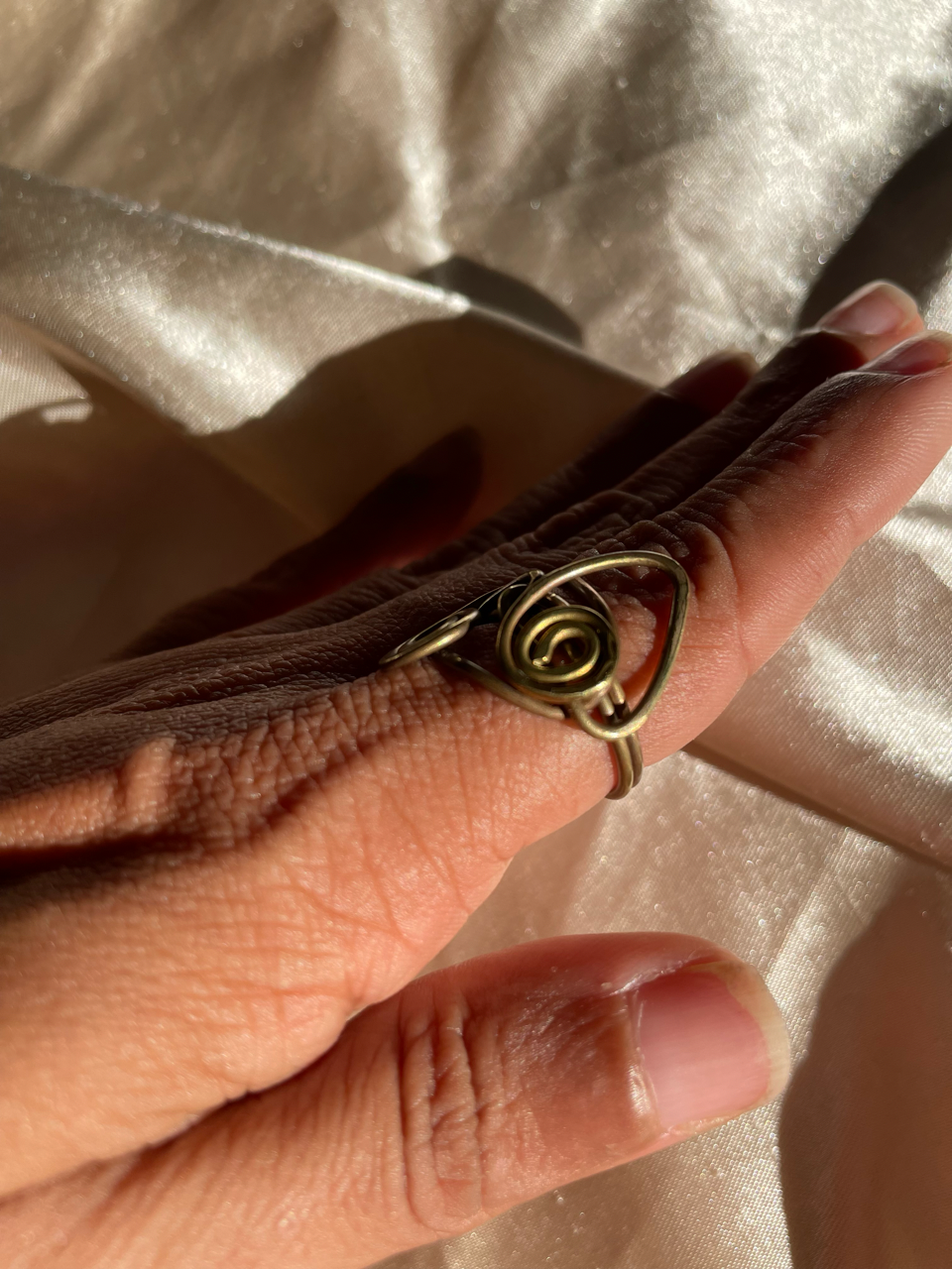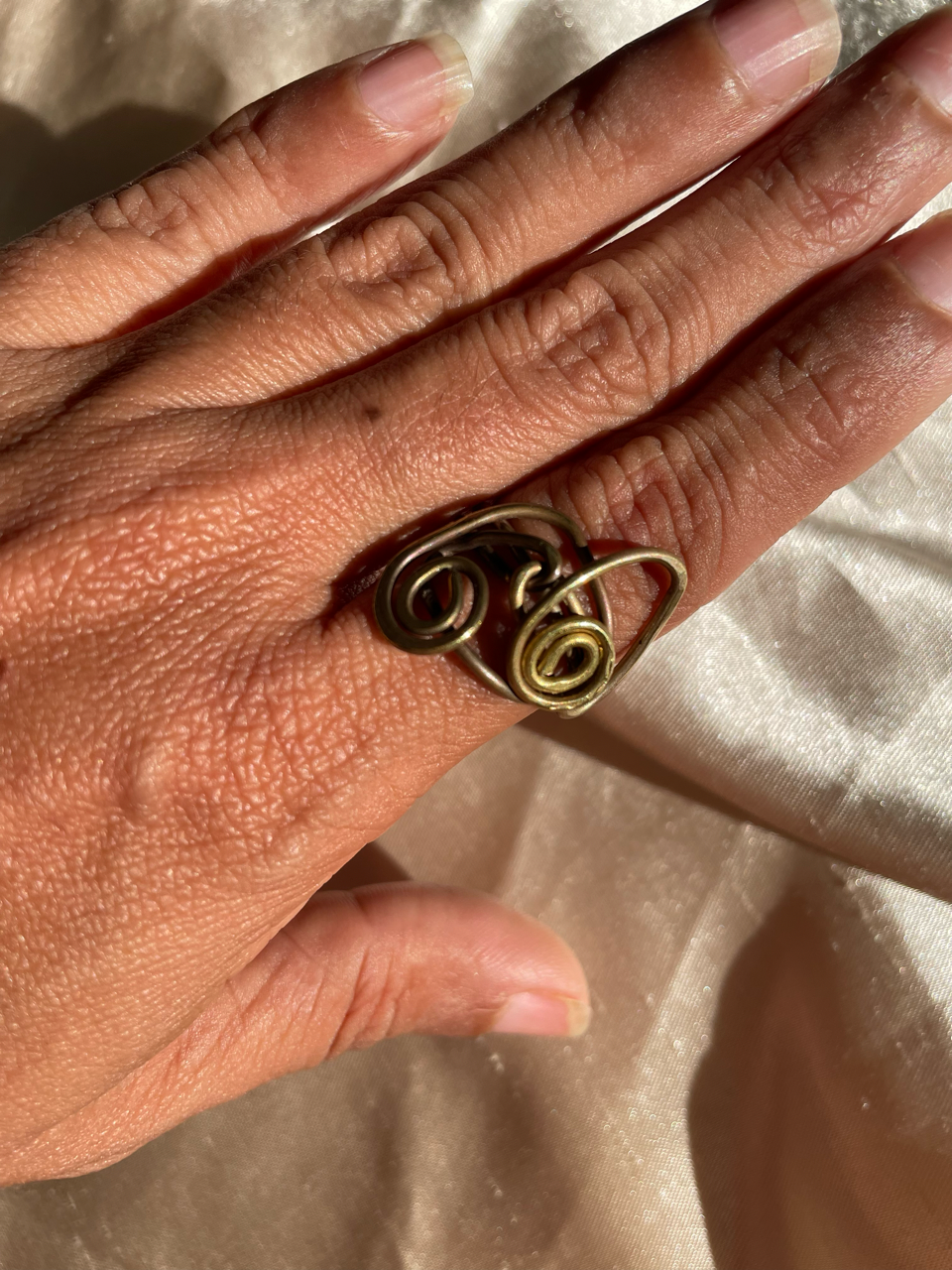 Una pieza que transforma el metal en movimiento. Esta sortija está elaborada con alambre de brass amarillo oxidado, moldeado a mano en espirales y curvas que evocan fluidez, expansión y energía vital. Su diseño abstracto y envolvente convierte cada ángulo en una declaración artística. Ligera pero impactante, esta joya es perfecta para quienes buscan estilo, simbolismo y originalidad en una sola pieza.